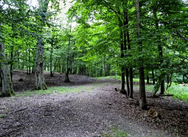 Du spazierst durch ein Stück Wald am Industriegebiet. Es dämmert.
