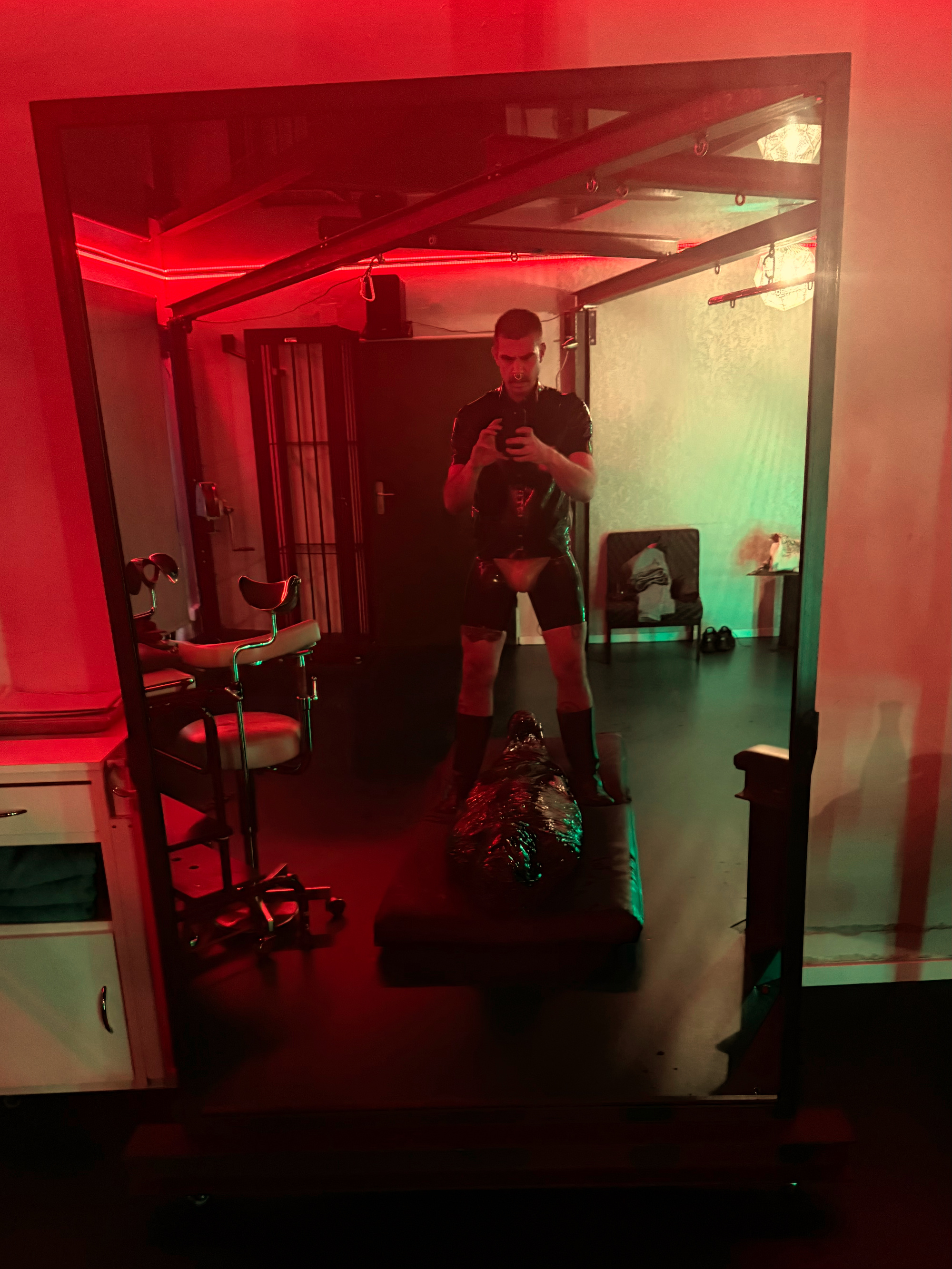 I returned to Master's boots and started to lick, the deepest sign of submission for me and the quickest way to get to the desired sub space. From then on i had no free will, if Master gave an order i followed it. After being ordered back on to my knees i looked at Master standing there in His latex, i was in awe. i followed His order to worship His body, my tongue and hands gliding over the shiny surface. Each second strengthening the Master slave bond between us.